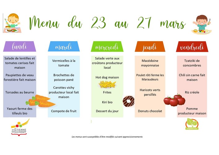 Voici le menu de la cantine pour cette semaine, retrouvez tous les menus dans la rubrique Au Quotidien - Restauration scolaire