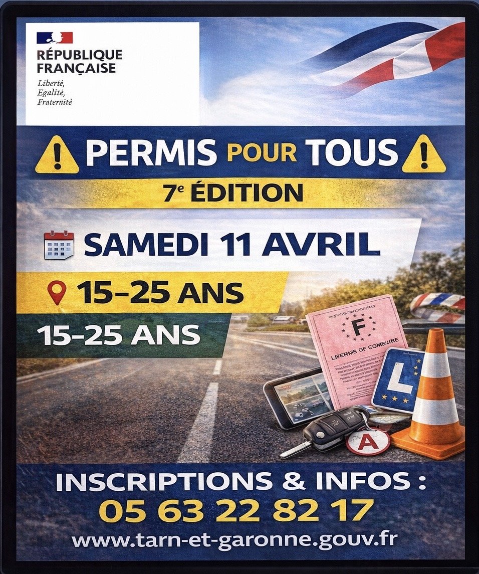 Le préfet de Tarn-et-Garonne, Vincent Roberti, et le Procureur de la République à Montauban, Bruno Sauvage, annoncent que les inscriptions sont ouvertes pour la 7ᵉ édition de la journée du « Permis pour tous », qui se tiendra le samedi 11 avril 2026 de 9h00 à 17h00 au Lycée Capou de Montauban.