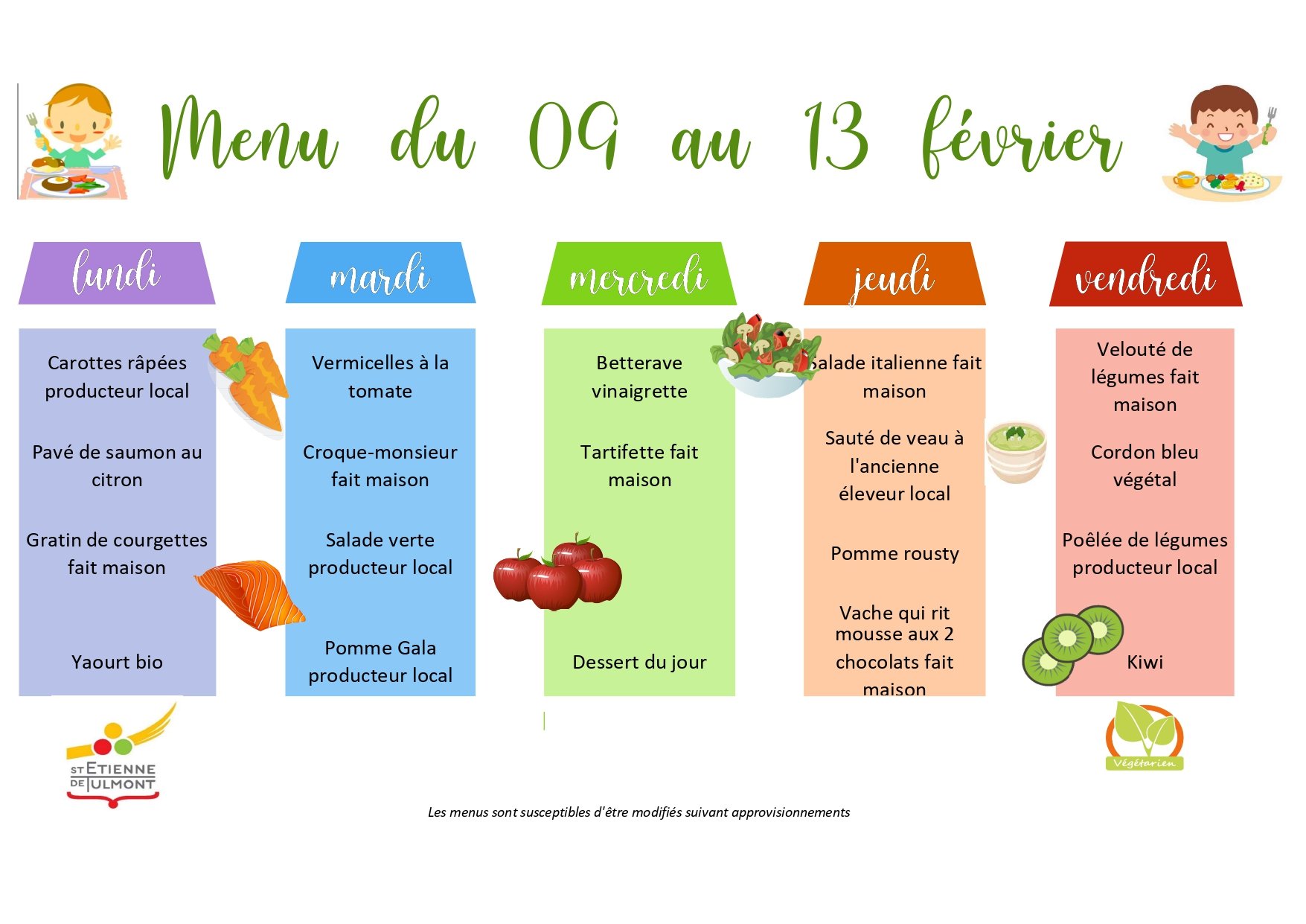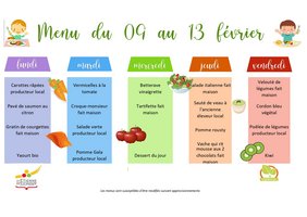 Voici le menu de la cantine pour cette semaine, retrouvez tous les menus dans la rubrique Au Quotidien - Restauration scolaire