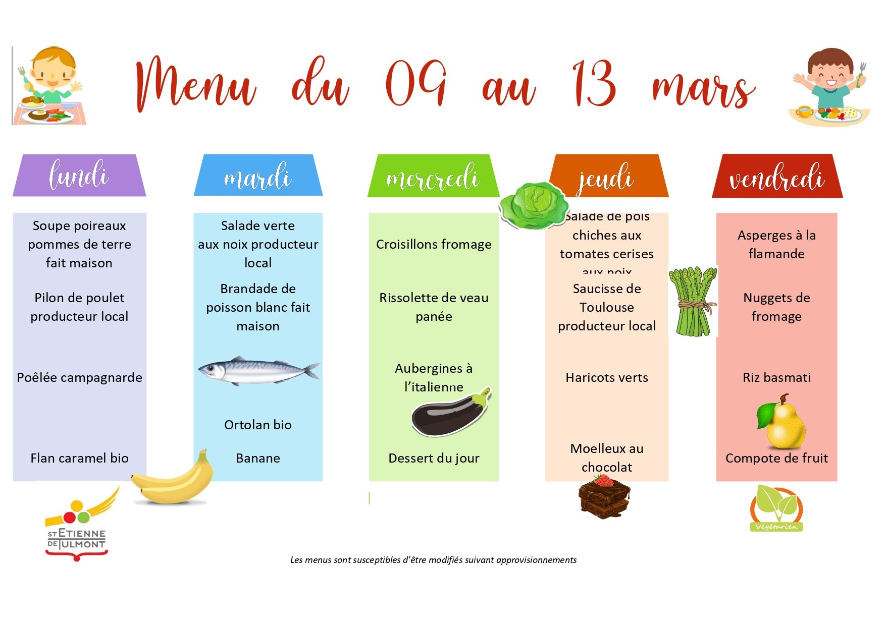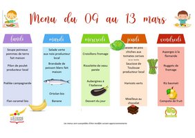 Voici le menu de la cantine pour cette semaine, retrouvez tous les menus dans la rubrique Au Quotidien - Restauration scolaire