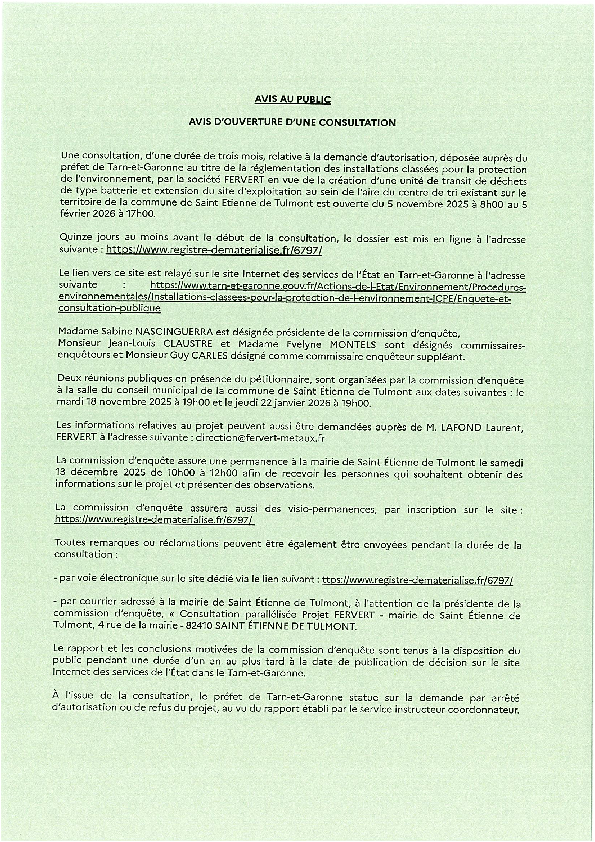 Une consultation, d’une durée de trois mois, relative à la demande d’autorisation, déposée auprès du préfet de Tarn-et-Garonne au titre de la réglementation des installations classées pour la protection de l’environnement, par la société FERVERT en vue de la création d’une unité de transit de déchets de type batterie et extension du site d’exploitation au sein de l’aire du centre de tri existant sur le territoire de la commune de Saint Etienne de Tulmont est ouverte du 5 novembre 2025 à 8h00 au 5 février 2026 à 17h00.