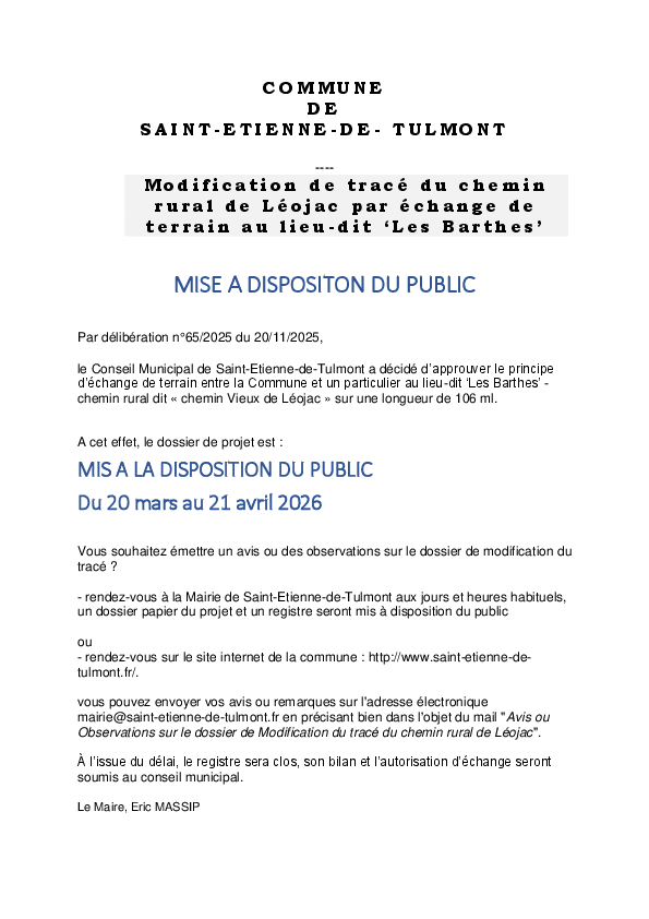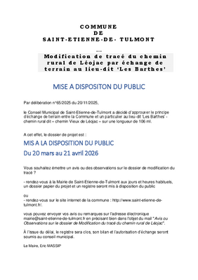 Par délibération n°65/2025 du 20/11/2025, le Conseil Municipal de Saint-Etienne-de-Tulmont a décidé d’approuver le principe d’échange de terrain entre la Commune et un particulier au lieu-dit ‘Les Barthes’ - chemin rural dit « chemin Vieux de Léojac » sur une longueur de 106 ml.