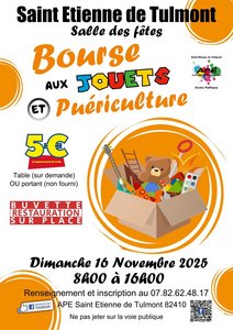 L'association des parents d'élèves des écoles publiques organise une Bourse aux jouets et puériculture le dimanche 16 novembre de 8h à 16h à la salle des fêtes.