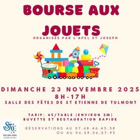 La bourse aux jouets de l'association des parents d'élèves de l'école Saint-Joseph aura lieu le 23 novembre à la salle des fêtes. Réservations au 07 68 46 45 38 ou 06 59 06 27 93
