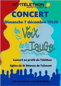 L'ensemble vocal de l'association Les Bords de Tauge vous propose un concert au profit du Téléthon ce dimanche 7 décembre à 15h30 en l'église de Saint-Etienne-de-Tulmont. Venez allier un moment de plaisir à une cause utile !
