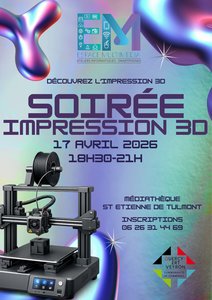 La médiathèque vous invite à participer à une soirée découverte de l'impression 3D le 17 avril prochain de 18h30 à 21h.