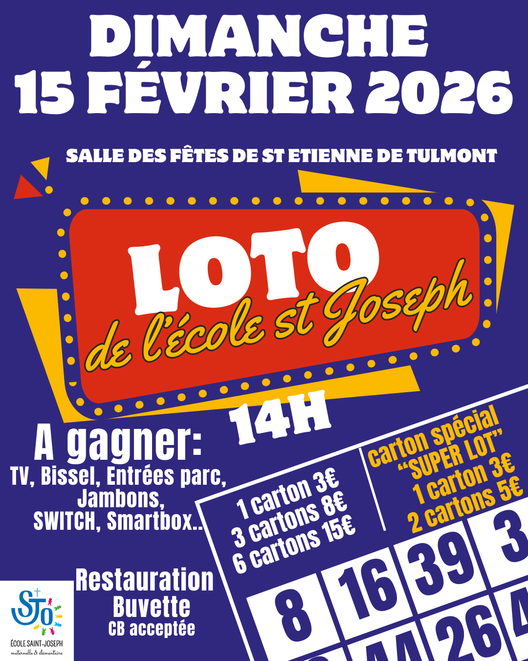 Le loto organisé par l'APEL Saint-Jo, l'association des parents d'élèves de l'école Saint-Joseph, aura lieu le dimanche 15 février à 14h à la salle des fêtes. Venez tenter votre chance et partager un moment convivial, de nombreux lots sont à gagner !