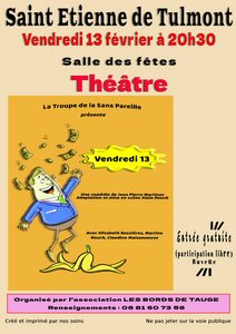 Soyez au rendez-vous le vendredi 13 février à 20h30 à la salle des fêtes ! La Troupe de la Sans Pareille présente "Vendredi 13", une comédie de Jean-Pierre Martinez. Cette soirée, organisée par l'association Les Bords de Tauge garantie les éclats de rire !