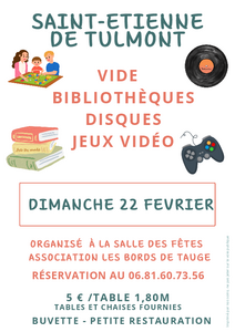 L'association Les Bords de Tauge vous propose un vide bibliothèque disques et jeux vidéo le dimanche 22 février à la salle des fêtes. Vous pouvez réserver votre emplacement au 06 81 60 73 56, et pour faire des bonnes affaires, rendez-vous le 22 février !