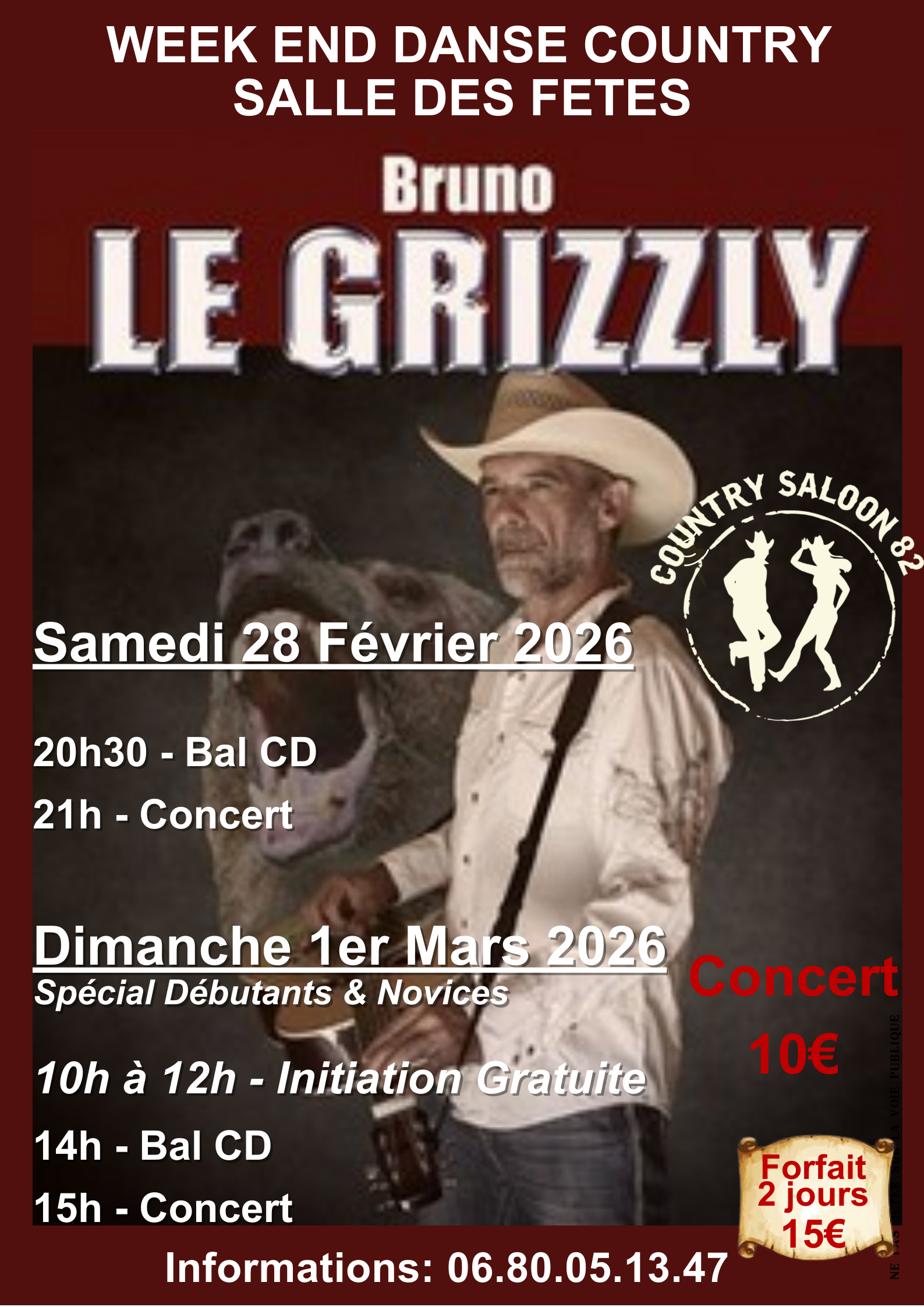 L'association Country Saloon 82 vous propose un week-end animé, à la salle des fêtes les 28 février et 1er mars. Le célèbre chanteur Bruno LE GRIZZLI se produira en concert, des bals CD et initiation à la danse country complèteront le programme.